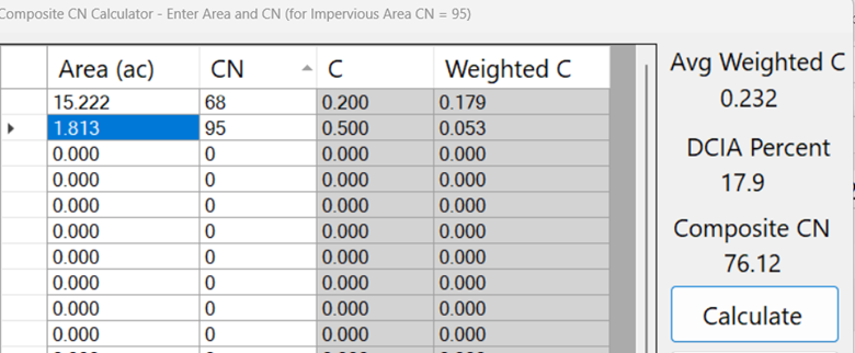 If directly connected impervious area (DCIA) is disconnected and routed to pervious areas before discharge, adjustments are made to the curve number calculations using the CN calculator support button adjacent to the Non-DCIA CN input.