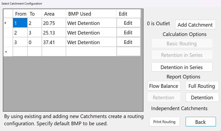 Edit Catchment Routing (Edit button in spreadsheet) – Allows you to edit the Catchment, BMP used, disable catchments, and remove catchments from routing.