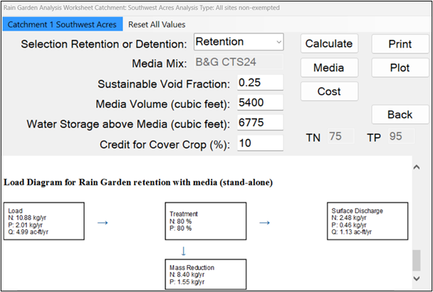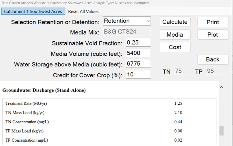 When using retention with media, groundwater loading and recharge volume can be determined by specifying a groundwater discharge analysis when setting the performance surface discharge standard on the site information worksheet.