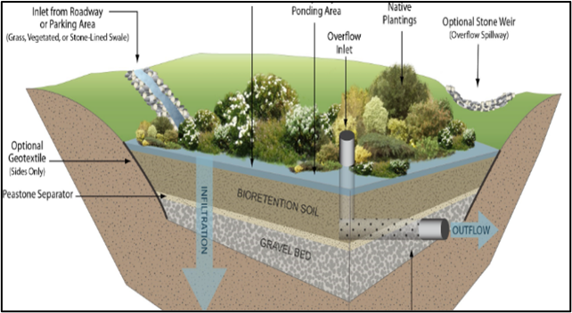 In situations where the Seasonal High Groundwater Table (SHGWT) is high, a rain garden is classified as a detention system and an underdrain is used. However, they do not function like a wet pond and therefore do not receive wet detention pond credit.